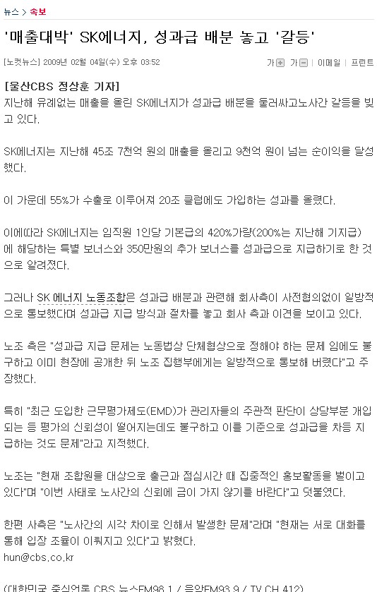 그러나 SK 에너지 노동조합은 성과급 배분과 관련해 회사측이 사전협의없이 일방적으로 통보했다며 성과급 지급 방식과 절차를 놓고 회사 측과 이견을 보이고 있다.